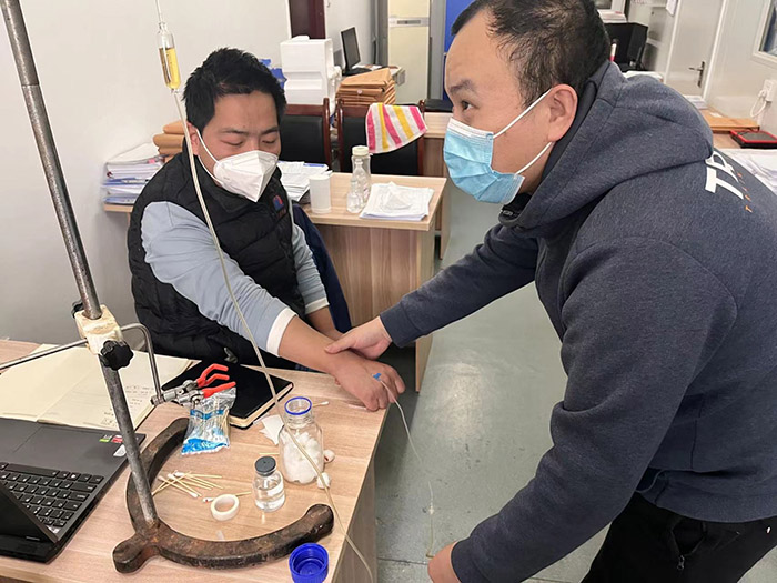 “哪位同事會輸液?”一聲令下孫江挺身而出來到三廠給王潤偉輸液扎針。由于第二天孫江工作需要脫不開身,眼看好轉的王潤偉沒有人給輸液了,這可怎么辦?我跟王潤偉說我扎過兔子,我敢下手,但是不一定能扎進去,你敢嗎?他笑笑說:“你在我這練練就會了。”我拿起輸液器嘗試了兩次仍沒有扎進去,緊張的我出了一身汗,抬頭看看王潤偉我十分抱歉的說:“真不好意思,兩針都沒進去。”他毫不在意的笑著說:“沒事多扎幾針就行了。”但是在強大的心理壓力下,我不敢再次嘗試。張總又一次緊急尋找能輸液扎針的人,最后找到了只扎過兩次針的道恩化驗室微生物組組長呂文杰。呂文杰看看王潤偉的手說:“你這確實不好扎。”兩針下去又沒有成功。扎過針的人都知道越是扎不中血管疼痛就會越劇烈,王潤偉沒有任何責備,一直保持著微笑,說到:“咱們換只手扎吧。”又一針下去終于成功了。呂文杰如釋重負,擦了擦頭上的汗對王潤偉豎起了大拇指。