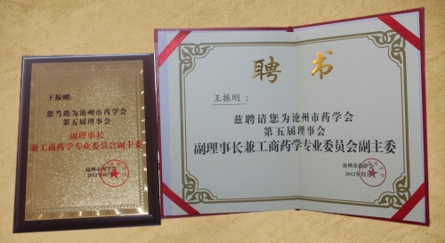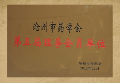 2013年3月份,由滄州市藥學會頒發給我公司“滄州市藥學會第五屆理事會員單位”銅牌,并聘請我公司董事長、總經理為滄州市藥學會第五屆理事會副理事兼藥學專業委員會副主委。
