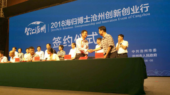 8月8日,“智匯滄州——2018海歸博士滄州創新創業行”簽約儀式在滄州國際會議中心舉行。董事長兼總經理王振剛應邀參加盛會并與兩名海歸博士成功簽約。