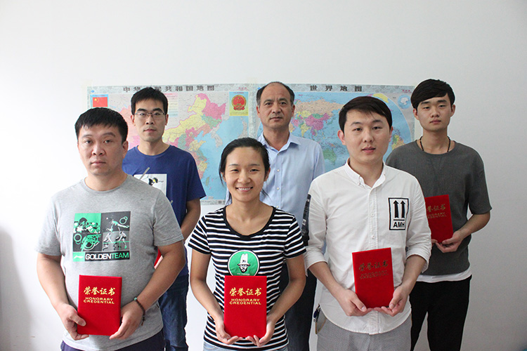 優秀員工與領導合影:(后排從左向右)高杰、王顥(常務副總)、李炳盈;(前排從左向右)王越、李海玲、王帥